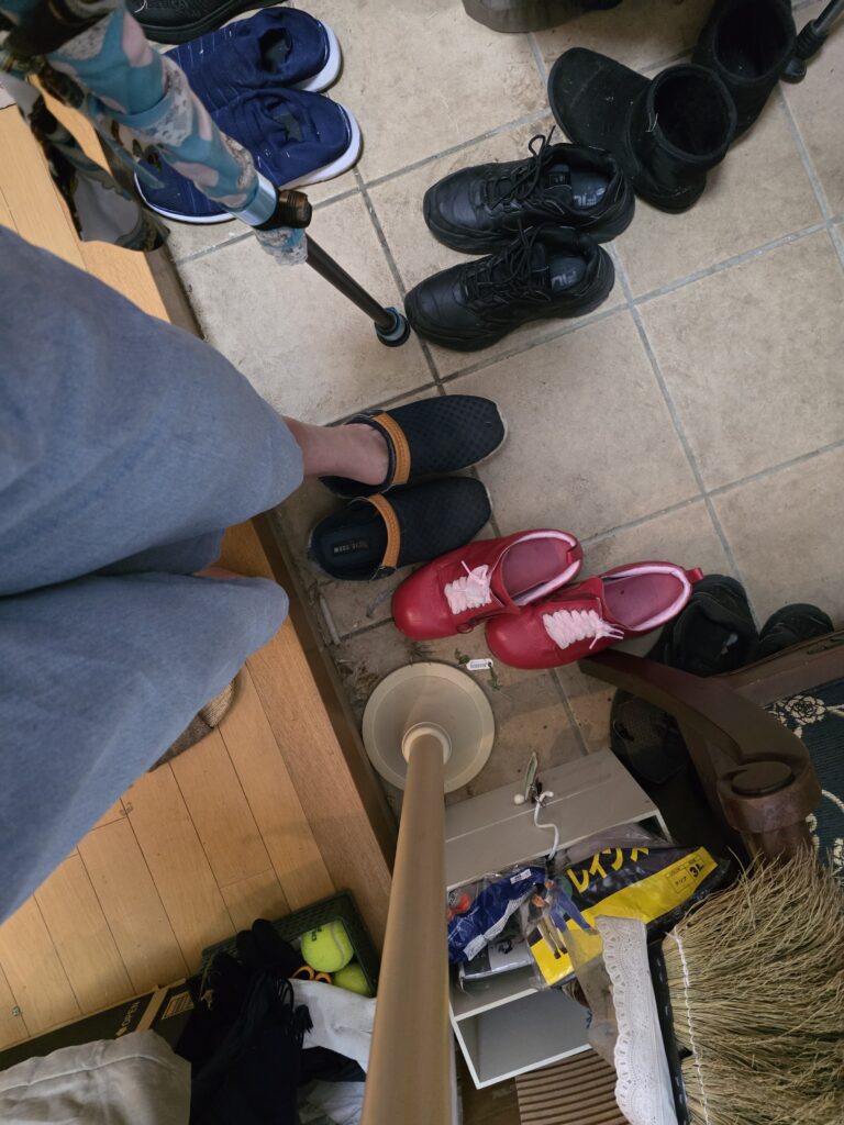 この3つがあるだけで、かなり安全になります。今回は、親の介護保険で借りている手すりも玄関に置いてあります。こういう補助具は、高齢者だけでなく、ケガのときにもとても役に立ちました。